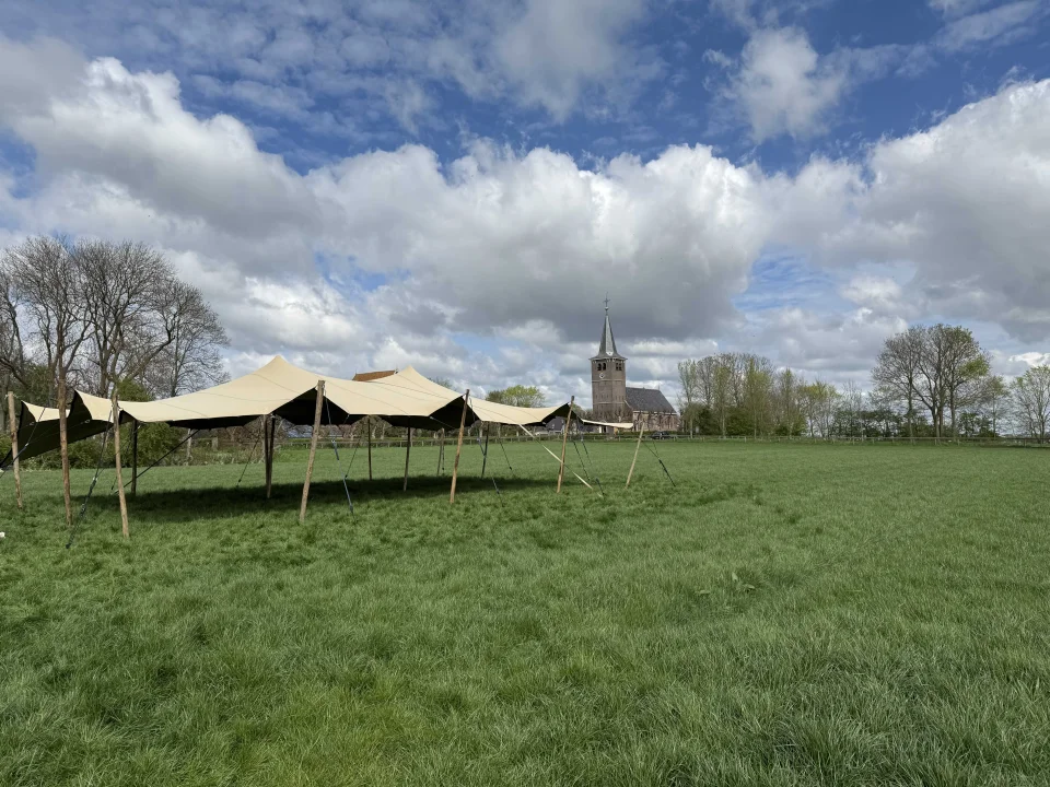 Voor de opbouw van de tent is een vrije ruimte van 12 x 17 meter nodig, in verband met de verankering. We gebruiken lange grondpennen (100 cm) voor een stevige plaatsing. Controleer vooraf of er ondergrondse kabels of leidingen aanwezig zijn. Zorg daarnaast voor voldoende doorgang voor een auto met aanhanger.